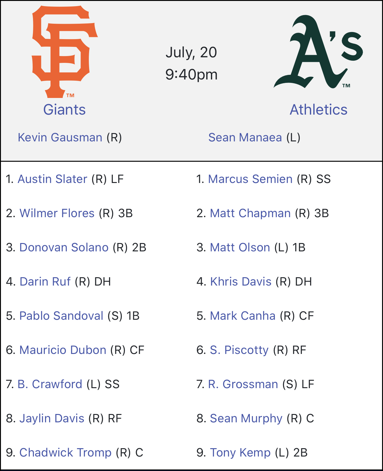 - The lineup is lacking a few notable starters in Alex Dickerson, Mike Yastrzemski, Evan Longoria, Brandon Belt and Hunter Pence.