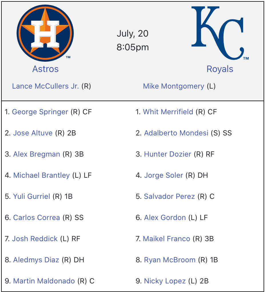 - Hunter Dozier is in the 3-hole and in a very solid top of the lineup. Pretty underrated as a whole with a top-5 that can do damage.